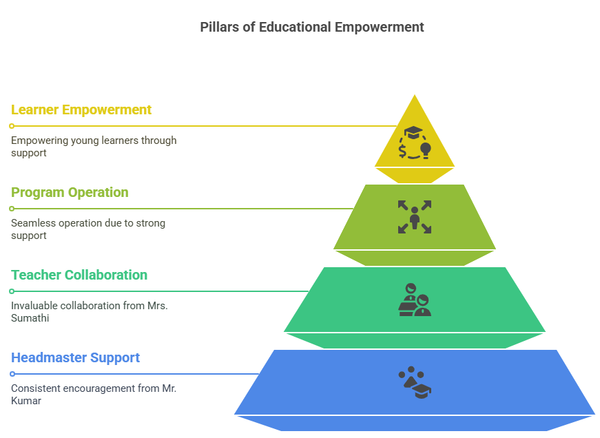 The seamless operation and reach of our program wouldn’t be possible without the incredible support we receive. We extend our sincere gratitude to Headmaster Mr. Kumar and the school’s English teacher, Mrs. Sumathi. Their consistent encouragement and collaboration are invaluable in helping us empower young learners.